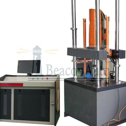 鐵路墊板動態(tài)試驗機 軌道墊板疲勞 軌枕 橡膠節(jié)點 鐵路墊板用于鋼軌和混凝土軌枕之間,它的主要作用是緩沖車輛通過路軌時所產(chǎn)生的高速振動和沖擊,保護路基和軌枕,并對信號系統(tǒng)進行電絕緣.鐵路墊板動態(tài)試驗機 軌道墊板疲勞 軌枕 橡膠節(jié)點試驗機廣泛應(yīng)用于材料和零部件的動、靜態(tài)力學(xué)性能試驗,包括材料和零部件的拉伸、壓縮、低周和高周疲勞等試驗。本試驗機可以滿足TB/T3396.1-2015《高速鐵路扣件》中要求的附錄A、B、C所規(guī)范的各種實驗方法。 結(jié)構(gòu)特征與工作原理:該機由主機、泵站、冷水機以及控制系統(tǒng)等幾部分組成。主機由底座、立柱、移動橫梁、作動器、抱緊缸以及升降油缸組成。四立柱安裝在工作臺上面。移動橫梁貫穿在四立柱上,橫梁貫穿孔外側(cè)開有鎖緊口,正面安裝有鎖緊油缸。兩升降油缸固定在移動橫梁上面對角穿過中線,活塞桿向下伸出反向托舉橫梁移動,橫梁通過升降油缸可沿立柱上下移動,完成空間調(diào)整。作動器安裝在移動橫梁上面中心位置,活塞桿自橫梁中心孔向下伸出,并與試驗上輔具連接。負荷傳感器安裝在活塞桿上面和作動器中心位置對中,下面工作臺部分為放置輔具和測量變形的傳感器。 鐵路墊板動態(tài)試驗機 軌道墊板疲勞 軌枕 橡膠節(jié)點技術(shù)規(guī)格: 1、大靜態(tài)試驗力:±250kN,靜態(tài)示值精度:全程不分檔 ±0.5%; 2、大動態(tài)試驗力:±250kN;動態(tài)波動度:不大于±1%。 3、作動器大振幅:±75mm,示值精度±0.5%。 4、頻率范圍:0.01—50Hz ,長時工作頻率0.01~50Hz。 5、位移測量精度:±0.5%示值 (全程不分檔) 6、位移測量分辨率(磁致伸縮位移傳感器):0.01mm 7、軌道墊板疲勞試驗機由主機、泵站、冷水機以及控制系統(tǒng)等幾部分組成。主機由底座、立柱、移動橫梁、作動器、抱緊缸以及升降油缸組成。四立柱安裝在工作臺上面。移動橫梁貫穿在四立柱上,橫梁貫穿孔外側(cè)開有鎖緊口,正面安裝有鎖緊油缸。兩升降油缸固定在移動橫梁上面對角穿過中線,活塞桿向下伸出反向托舉橫梁移動,橫梁通過升降油缸可沿立柱上下移動,完成空間調(diào)整。作動器安裝在移動橫梁上面中心位置,活塞桿自橫梁中心孔向下伸出,并與試驗上輔具連接。負荷傳感器安裝在活塞桿上面和作動器中心位置對中,下面工作臺部分為放置輔具和測量變形的傳感器。 標簽:鐵路墊板動態(tài)試驗機 軌道墊板疲勞 軌枕 橡膠節(jié)點