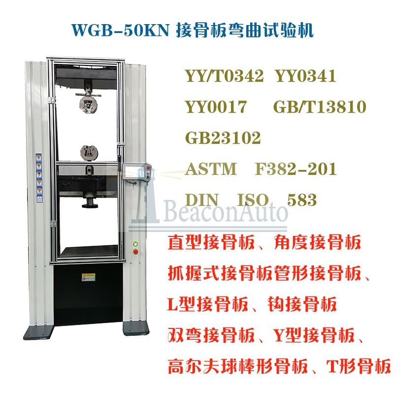 WGB-500醫用接骨板彎曲試驗機 醫用接骨板彎曲試驗機產品型號:WGB-500 醫用接骨板彎曲試驗機產品用途:醫用接骨板彎曲試驗機主要用于骨接合植入物金屬接骨板在室溫環境下進行拉伸試驗、壓縮試驗、彎曲試驗,以及骨科材料機械力學性能實驗測試及研究。 可測試以下材料:骨結合植入物、外科植入物、直型接骨板、角度接骨板、抓握式接骨板、管形接骨板、L型接骨板、鉤接骨板、雙彎接骨板、Y型接骨板、高爾夫球棒形骨板、T形骨板等。 可檢測以下技術指標:彎曲強度和剛度;等效彎曲剛度;載荷-撓度曲線;撓度;抗拉強度;屈服強度;上屈服強度;下屈服強度;規定非比例延伸強度;斷后伸長率;斷面收縮率等。 醫用接骨板彎曲試驗機依據標準: 1. YY/T0342 -外科植入物接骨板彎曲強度和剛度的測定; 2. YY0341-骨接合用無源外科金屬植入物通用技術條件 3. YY0017-骨接合植入物金屬接骨板 4. GB/T13810-外科植入物用鈦及鈦合金加工材 5. GB23102外科植入物金屬材料Ti-6Al -7Nb合金加工材 6. ISO 5832-12-外科植入物.金屬材料.第12部分:鍛造鈷鉻鉬合金; 7. ISO 13356- 外科植入物.釔穩定正方晶相氧化鋯(Y-TZP) 陶瓷材料 8. NF S94-063-外科植入物-Yttri a穩定的四角形鋯基陶瓷材料; 9. ASTM F382-201 4金屬骨板規格與試驗方法; 10.DIN ISO 5832-9- 外科植入物金屬材料第9部分:鍛制高氮不銹鋼 醫用接骨板彎曲試驗機產品特點: 1. 精密無間隙滾珠絲杠、高剛性、高穩定性的門式載荷機架,機架尺寸可定制。 2.高精度測力器,線性寬,穩定性好,保證載荷的測力精度。 3.高速率、低振動、免維護、靜音型交流伺服電機驅動系統。 4.電路板采用光電隔離設計,具有抗干擾能力強的特點。 5.內置以太網接口;方便的手持控制器,即停即行功能;操作靈活、隨意切換。 6.多種完善的試驗夾具,快速更換;可選T型工作臺、防旋轉夾具/附件裝置、環境系統、引伸計。 7.寬泛的測試速度0.001 ~600mm/min (可定制高速試驗機1000mm/min; 1500mm/min; 2000mm/min) 。 8.全數字閉環、多通道、多功能、易操控的HLXK-Test測控軟件;多種標準方法(國標、英標、美標、德標、澳標、日標、意標、俄標、歐標/GB、IS0、 JIS、 ASTM、DIN、BS、EN)。 9.試驗過程的自動控制、數據采集、處理、分析、存儲及顯示。 10.載荷自動保持、應力、應變控制、循環控制及自編程控制等多種控制方式。 11.控制模式智能設置,控制方式之間無沖擊、平滑切換,加載、卸載平穩。 12.過程再現和數據再分析、曲線放大、比較、遍歷;曲線可自由放大和縮小;滿度自調。 13.靈活的Exce1或Word報告格式,可選擇、指定、排序、單獨、合并、多類型輸出。 14.試驗結束自動返回,智能、高效、快捷。 15.多重保護功能:試驗力過載保護;過流、過壓保護;試樣破斷時安全保護;超溫保護;干燒保護;缺水保護;操作提示向導保護;試驗結束自動保護等。 醫用接骨板彎曲試驗機主要技術指標: 1. 最大試驗力:20kN 2. 測 量 范 圍:最大試驗力的0.4%-100%。 3. 試驗力精度:優于示值的±0.5% 4. 試驗力分辨力:1/300000(全程不分檔或等效6檔) 5. 橫梁位移測量精度:分辨率高于0.001mm 6. 變形測量精度:±0.5%(在0.2-10mm范圍內) 7. 試驗速度范圍:0.01-500mm/min,無級調速 8. 速度控制精度:±1%(0.01-10mm/min);±0.5%(10-500mm/min) 9. 恒力、恒變形、恒位移控制范圍:0.2%-100%FS 10. 夾具形式:見附件 11. 整機電源:單相,220V±10%,50Hz,功率:1.5kW 12. 工作環境:室溫—35℃,相對濕度不超過80% 13. 主機尺寸:760mm×530mm×1760mm 14. 整機重量:420kg 更多醫用接骨板彎曲試驗機資料請聯系我們濟南信標自動化設備有限公司。專業生產液壓萬能試驗機,疲勞試驗機,扭轉試驗機,高溫蠕變試驗機,彈簧試驗機,彎曲試驗機,沖擊試驗機,彎曲強度試驗機,抗拉強度試驗機等。