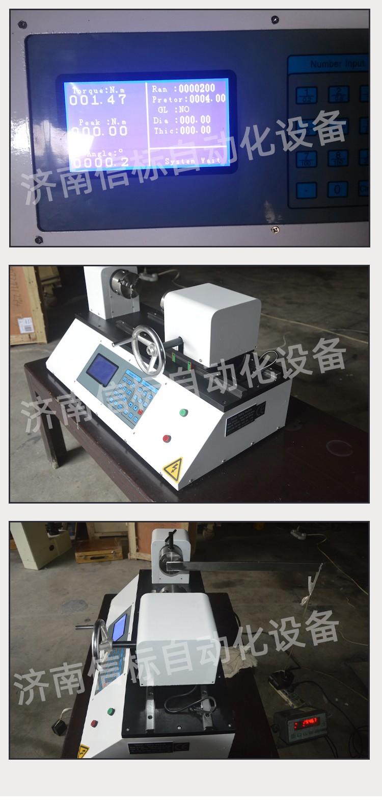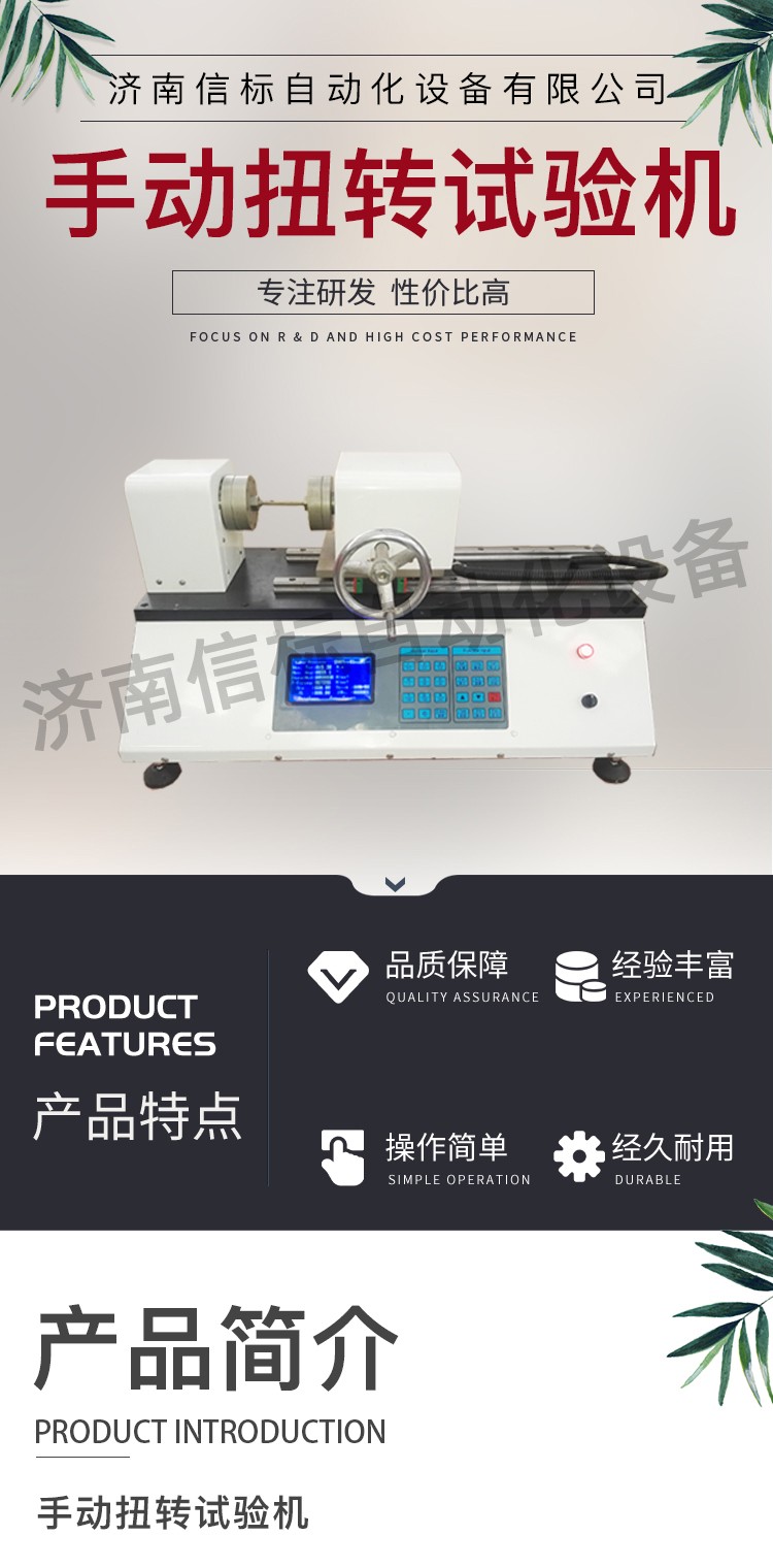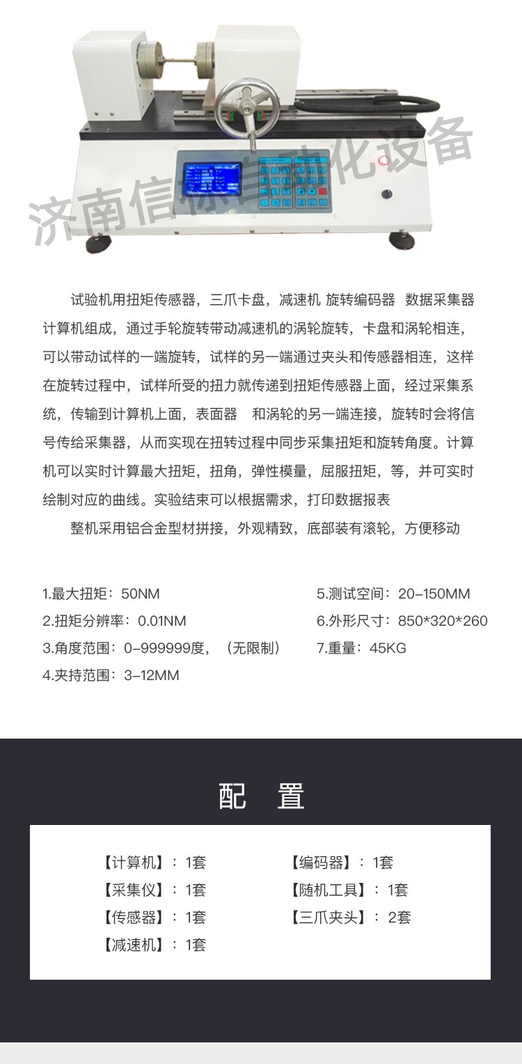 試驗機用扭矩傳感器,三爪卡盤,減速機 旋轉編碼器  數據采集器 計算機組成,通過手輪旋轉帶動減速機的渦輪旋轉,卡盤和渦輪相連,可以帶動試樣的一端旋轉,試樣的另一端通過夾頭和傳感器相連,這樣在旋轉過程中,試樣所受的扭力就傳遞到扭矩傳感器上面,經過采集系統,傳輸到計算機上面,表面器 和渦輪的另一端連接,旋轉時會將信號傳給采集器,從而實現在扭轉過程中同步采集扭矩和旋轉角度。計算機可以實時計算最大扭矩,扭角,彈性模量,屈服扭矩等,并可實時繪制對應的曲線。實驗結束可以根據需求,打印數據報表,整機采用鋁合金型材拼接,外觀精致,底部裝有滾輪,方便移動。試驗機用扭矩傳感器,三爪卡盤,減速機 旋轉編碼器  數據采集器 計算機組成,通過手輪旋轉帶動減速機的渦輪旋轉,卡盤和渦輪相連,可以帶動試樣的一端旋轉,試樣的另一端通過夾頭和傳感器相連,這樣在旋轉過程中,試樣所受的扭力就傳遞到扭矩傳感器上面,經過采集系統。