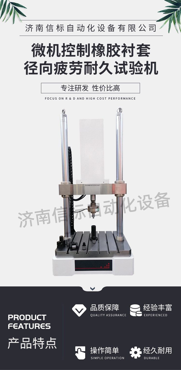 濟南信標自動化設備有限公司主要生產:動靜態萬能疲勞試驗機,接骨板彎曲試驗機,縫合線拉伸疲勞試驗機,髖膝關節磨損試驗機,電子萬能試驗機、液壓萬能試驗機、巖石三軸、四軸,電液拉力試驗機,材料試驗機,高低溫蠕變,高低頻疲勞,拉伸、扭轉、杯突等二十多個系列兩千多個的品種。